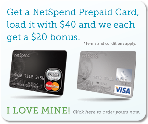 Netspend has a referring program now also. For every person who gets a card using your link or code, once they get the card and load it with $40 you get $20 and they get $20 also! Of course you have to get a free card also. I already had a Netspend Visa I got from previous refunds but the refer a friend program only works with their mastercard cards. So I got another card lol.